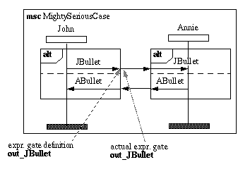 In Figure "Inline expression" the gates to/from the expression frames all propagate to the frame of the MSC diagram. In Figure "Gates" we have given an artificial example which also shows the propagation of a message gate.