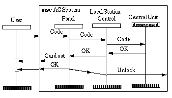 In Figure "General order relation" we may wonder from where the Code message comes and to where the Card out , OK and Unlock messages are to be sent. We could have been tempted to including the User instance also in the MSC AC System. What we then would have done is to expand the AC System instance in a new MSC, and if both the old MSC and the new MSC are in the same MSC document, there is an overlap of situations which should be kept consistent, but where MSC as a language does not help.
