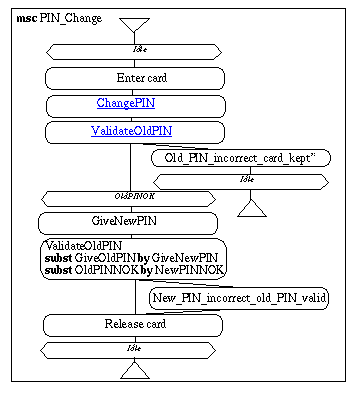 In our example there is an MSC for PIN_Change which include a message ChangePIN which is broken down in the MSC ChangePIN . The merged MSC diagram is shown in Figure "Modified MSC diagram"