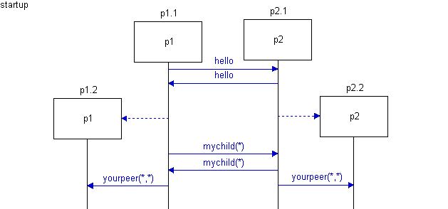 1/ Non determinism: you solve the problem by starting with just 1 instance of each process on each block (p1.1 and p2.1). While you have only 1 instance, you can have them talk to each other without risk of non-determinism. Once the 1st instances know about each other, they can create themselves an offspring on each side (p1.2 and p2.2) and let their peer know their offspring (mychild) and their offpring share that information (yourpeer).