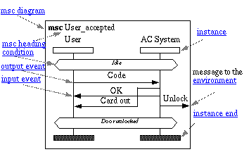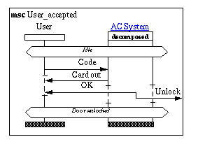 In Figure "General order relation" we may wonder from where the Code message comes and to where the Card out , OK and Unlock messages are to be sent. We could have been tempted to including the User instance also in the MSC AC System. What we then would have done is to expand the AC System instance in a new MSC, and if both the old MSC and the new MSC are in the same MSC document, there is an overlap of situations which should be kept consistent, but where MSC as a language does not help.