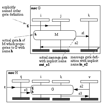 Gates in MSC as shown in Figure "Gates" are very much the same way. For a surrounding MSC diagram, the Mansion is just a reference M where the gates out_s1 and h are known. How the internal communication of M is, has no effect on the communication between the Mansion M and its surroundings. When the messenger boy turn up at gate out_s1 , he will get an s1 message which he delivers to instance k in the surroundings according to the MSC G .