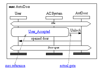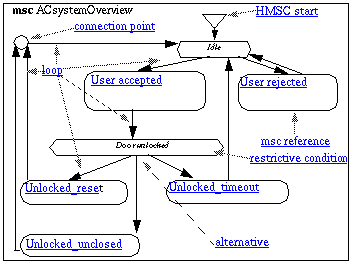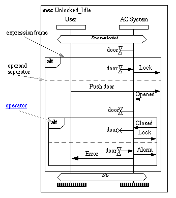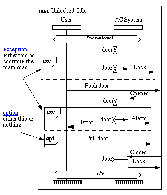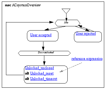 The reader should also notice that an MSC reference has only one entry and one exit. Thus there are no ways to continue possible alternatives of User_Accepted into Unlocked_Idle (there are no alternatives in these diagrams here). 1