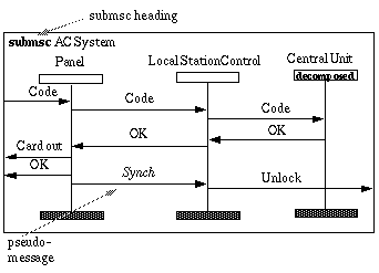 In Figure Figure: the pseudo-message Synch makes the ordering of the interface events strict. This is necessary since the interface is to correspond to an ordering expressed on one instance line. Without the pseudo-message Synch , we have in MSC-92 no way to express that output of OK precedes output of Unlock . In MSC-92 on one instance either a strict ordering or no ordering (coregion) could be expressed.