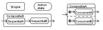 A state is shown as a rectangle with rounded corners. The state has one name compartment that may be empty. It may also have a compartment for internal actions. This compartment may be omitted. Figure 13 shows the four types of states in UML.