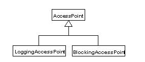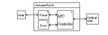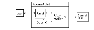This design may be continued. Each access point is designed to contain three objects, one for handling the panel of the access point, one for handling the central unit and one for handling the door. This is specified by using composition, but now applied to the class AccessPoint, see Figure 20 .