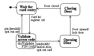 Figure 21 and Figure 22 show two statecharts for the AccessPoint’s Controller class. Figure 21 shows the behaviour of the Controller class at an general level. The state "Validate access code" is a composite state. When the state machine enters this state the state machine "Validate PIN" (shown in Figure 22 ) is activated.