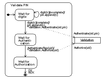 The state machine "Validate PIN" is shown in Figure 22 . Here it is shown explicitly that the signals/messages Authenticate and Authorize are sent to another object, namely the Validation object.